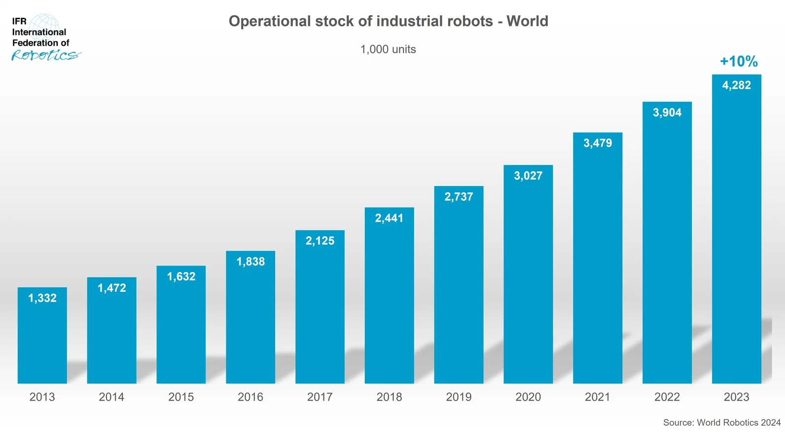 The latest report from the International Federation of Robotics (IFR) reveals a significant trend in the adoption of industrial robots globally. As depicted in the chart from "World Robotics 2024," the operational stock of industrial robots has been growing steadily, indicating the rapid shift towards automation in various industries. The graph, sourced from the World Robotics 2024 report, illustrates a steady upward trend in the number of industrial robots deployed across the globe from 2013 to 2023. The data showcases a remarkable growth of over 10% in the operational stock between 2022 and 2023, reaching 4,282,000 units.